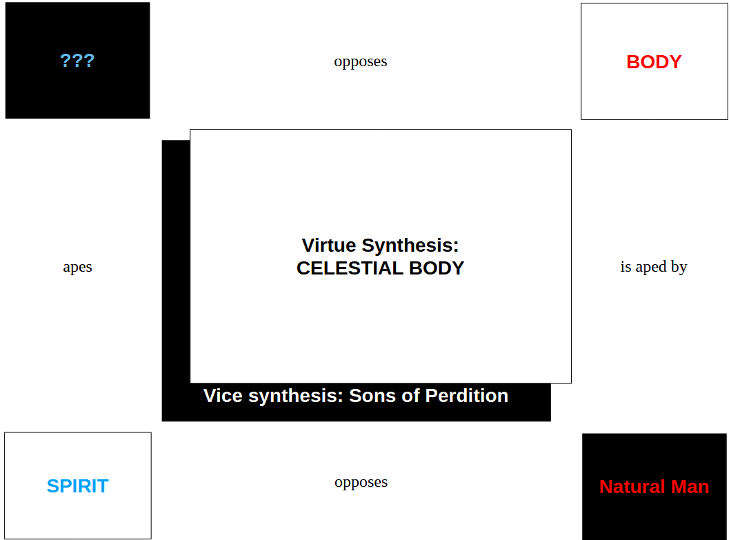It’s tempting to say that in Body and Spirit we have found the two general virtue categories that we have been looking for and have been calling Hot and Cold.  That’s how I labeled them on the synthesis chart.  But I don’t think that holds up.  Just as with male and female, we can find hot and cold attributes of both.  Fatigue and lethargy is bodily and dreams and symbols are spiritual.  Hot and cold may just be its own dimension of reality.  I suspect it is something to do with the time dimension.  The Hot virtues and vices are now, and the Cold ones are future.